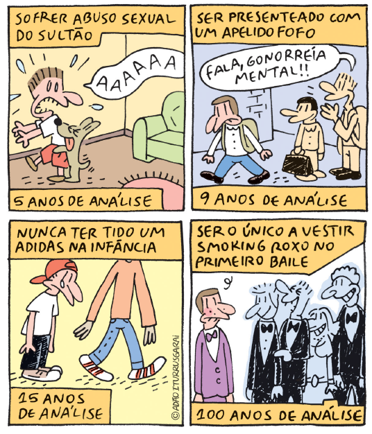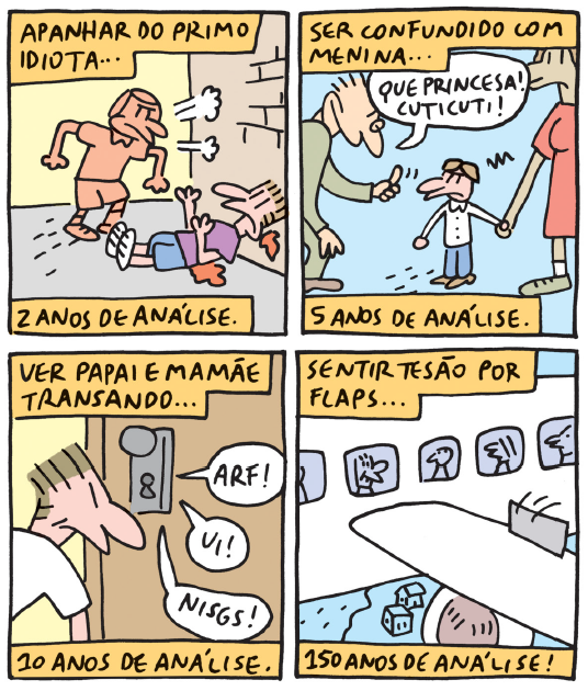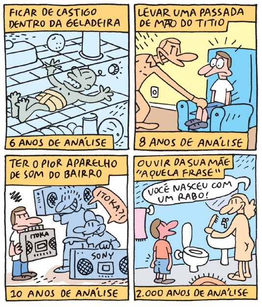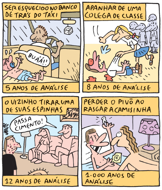 Foi na época da terapia em São Paulo que comecei a madurar a idéia pra esta série de tiras. À medida que contava minha vida e os prováveis traumas, começava a calcular quanto tempo teria de ficar no divã para resolver cada evento. Uma coisa quase matemática.