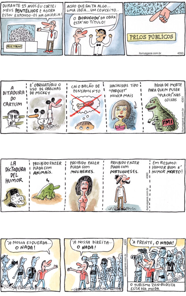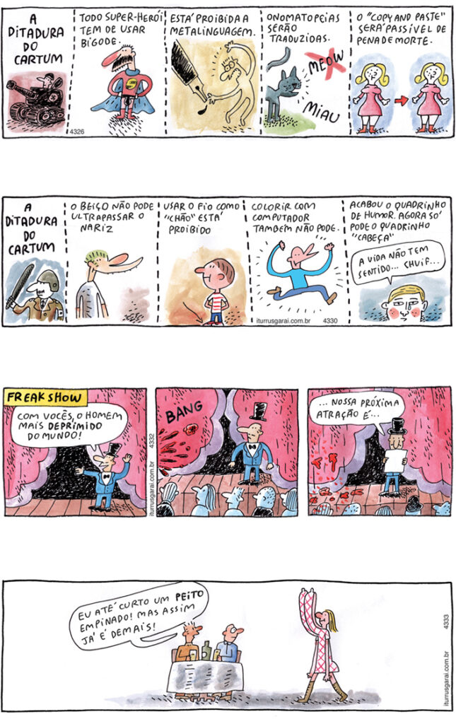 Também deixei de fora as tiras já publicadas em outros livros de cartuns, para não torturar o leitor com repetições e sensações de déjà-vu.