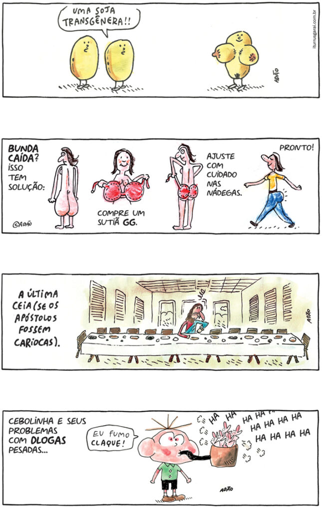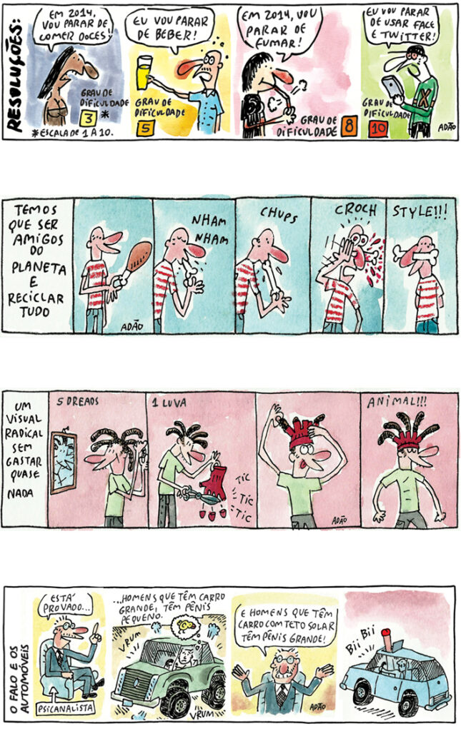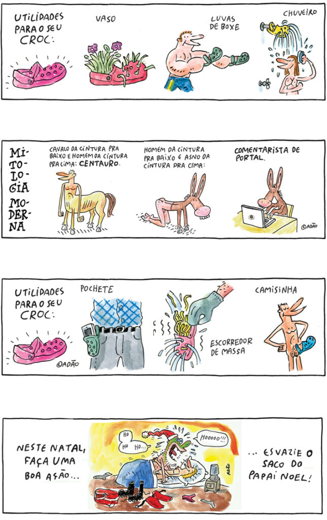 As tiras com personagens mais conhecidos — como Aline, Rocky & Hudson, La vie en rose, Chato de Galochas, Fossinha e Troncho —, assim como as que tratam de temas como amor, relacionamento e psicanálise, ficaram de fora desta seleção. Essas, junto com alguns cartuns, já têm uma coletânea própria ou terão em breve.