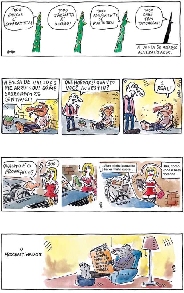 As tiras com personagens mais conhecidos — como Aline, Rocky & Hudson, La vie en rose, Chato de Galochas, Fossinha e Troncho —, assim como as que tratam de temas como amor, relacionamento e psicanálise, ficaram de fora desta seleção. Essas, junto com alguns cartuns, já têm uma coletânea própria ou terão em breve.